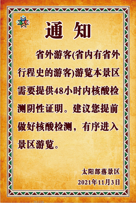 提醒!省外游客(省內(nèi)有省外行程史游客)游覽太陽部落景區(qū)須持48小時內(nèi)核酸陰性證明!